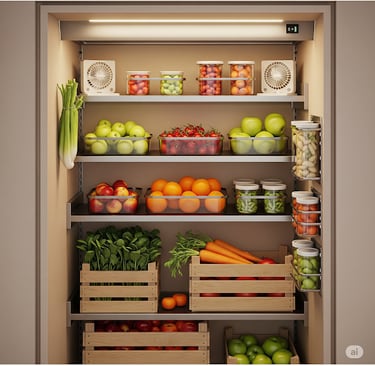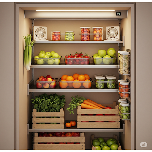 In a big ventilated closet, fruits and vegies are stored, well organized, some fruits dont like to be next to each other, organizing them strategiqly can help reduce your need for a fridge. Or at least save space in it.