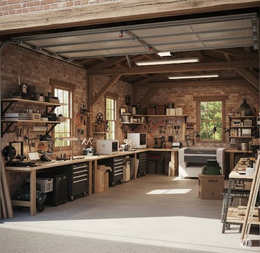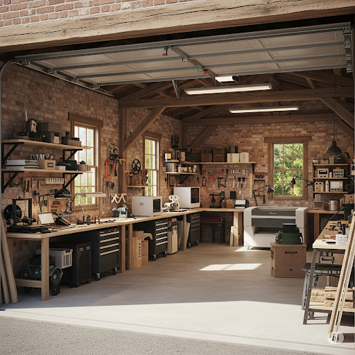 Another door opens on The garage, a bigger tool shop, with tools and equipement for any job, you ll find a welding machine, a sawing machine, a nice workbench.