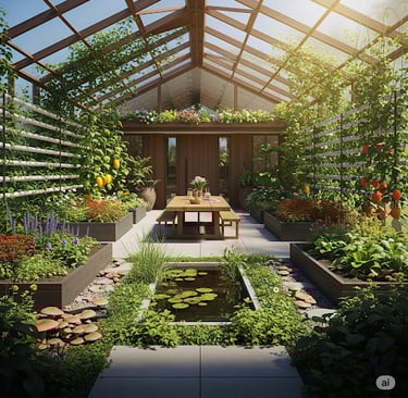 Here you find lush beautiful plants in earth raised bed, a nice stone path, different hydroponic set up for different plants theres some lighting spots to boost the growth, a little pond brings some interesting evaporative cooling effect, velux on the roof to regulate temperature, bunch of different growing technic and plant types, mushroom strawberry, pumpkin, zuchini tomato ..
