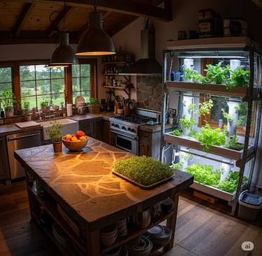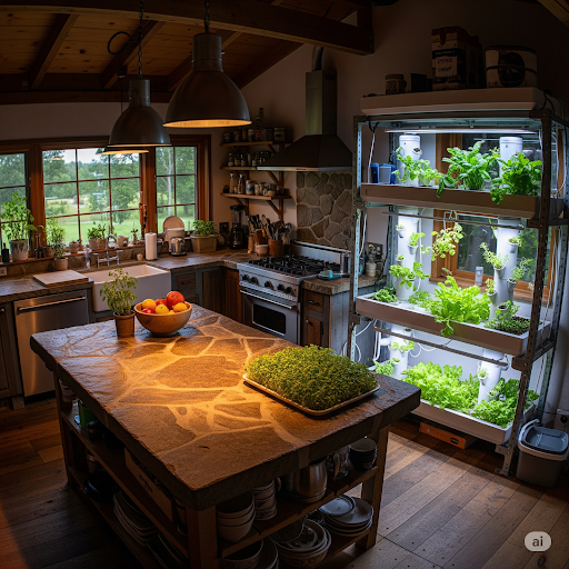 The Kitchen is the hearth of the home, you ll find a little micro green and hydroponic garden, all the kitchen appliances like the fridge, freezer,