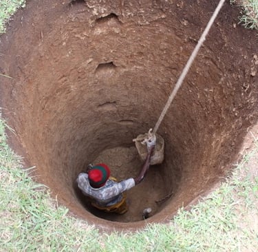 Once the hole is dug consolidate it with pvc tubes with a filter at its extremity and then, a submersible pump goes in. ready to go.